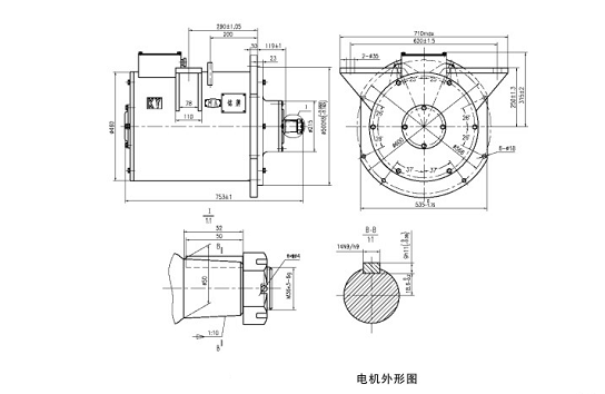 該電機(jī)系CJY14-6.7.9/550及CJY14-6.7.9/250二級(jí)傳動(dòng)的交流變頻架線式礦用電機(jī)車主牽引電動(dòng)機(jī)。該電機(jī)具有結(jié)構(gòu)簡(jiǎn)單、高效、節(jié)能、免維護(hù)、運(yùn)行平穩(wěn)等優(yōu)點(diǎn)。